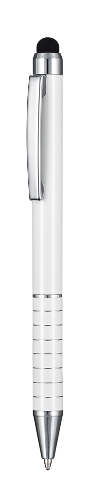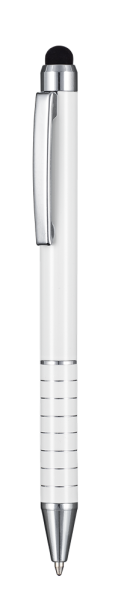 Metallkugelschreiber mit Drehmechanik mit matt-weißem Metallschaft und glänzenden Applikationen. Blau-schreibende Mine. Zusatzfunktion: Gummikappe zur Bedienung von Smartphones, Tablet PCs etc.
