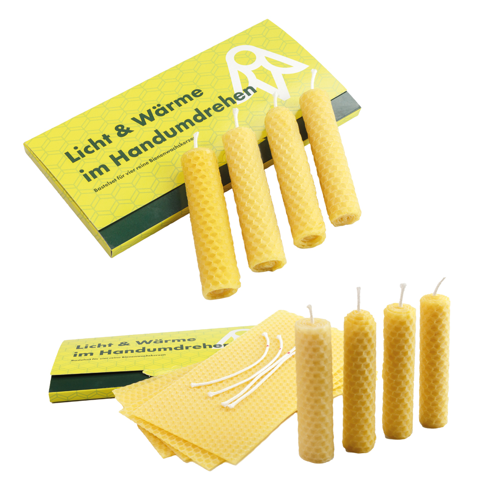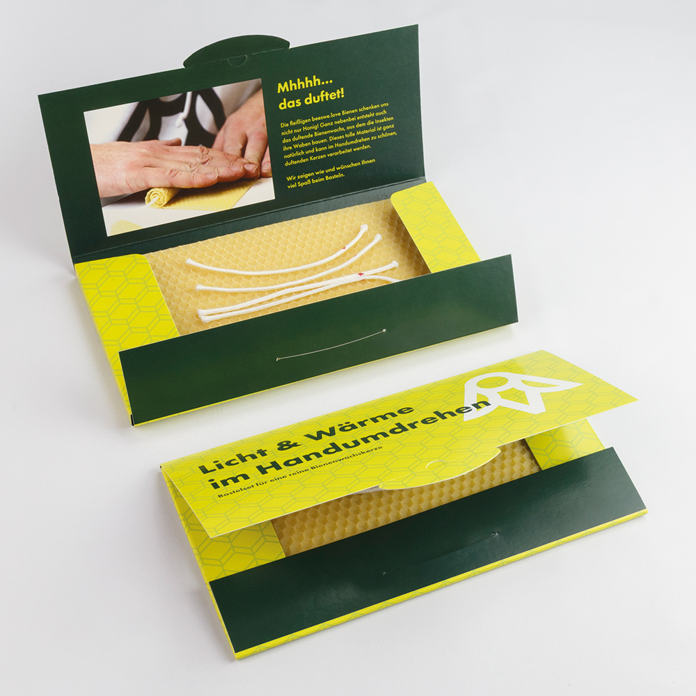 Das Kerzenbastelset lädt dazu ein, mit wenigen Handgriffen vier eigene Kerzen aus reinem Bienenwachs herzustellen. Enthalten sind vier hochwertige Bienenwachsplatten und vier passende Dochte, verpackt in einem DIN-Lang Umschlag. Eine verständliche Anleitung sowie die nötigen Sicherheitshinweise sind integriert, sodass das Bastelerlebnis unkompliziert und sicher gelingt. Der Umschlag kann individuell gestaltet werden und macht das Set zu einem persönlichen Geschenk mit emotionalem Charakter. Lichtzauber eignet sich ideal für Kundengeschenke, Mitarbeiteraktionen, Weihnachtsmailings oder kreative Events und verbindet natürliche Materialien mit einem stimmungsvollen Erlebnis.