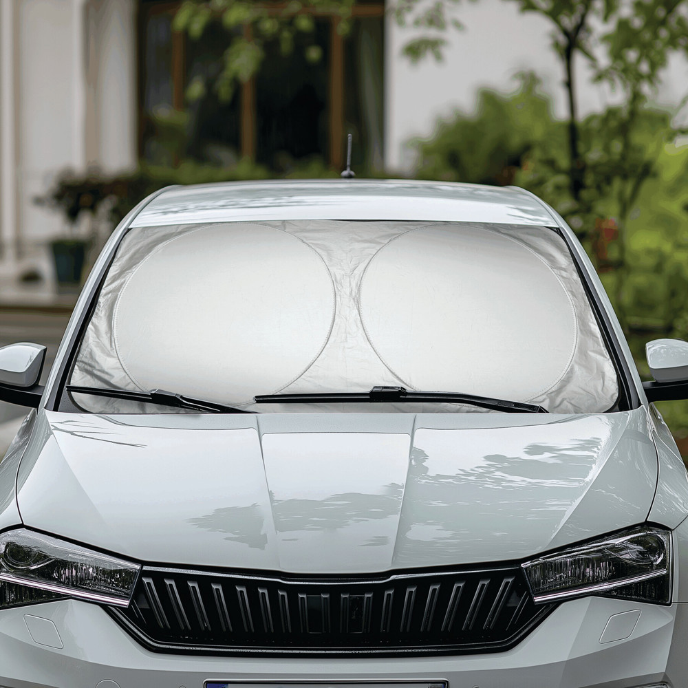 Auto-Sonnenschutz SUN SHIELD: silberne Oberfläche mit schwarzer Rückseite, bei Nichtgebrauch durch Gummischlaufe platzsparend faltbar, inkl. Aufbewahrungstasche