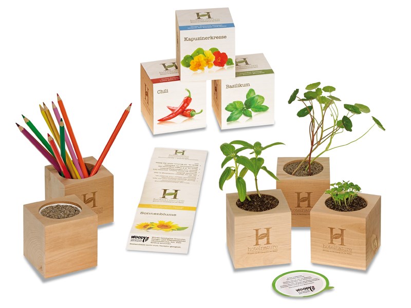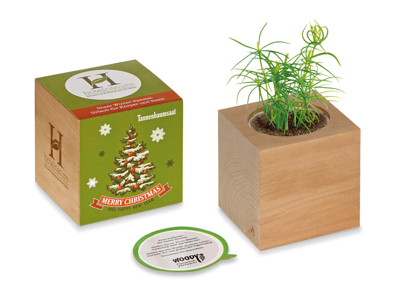 Woody ist ein edler, massiver Holzkubus, gefüllt mit einem speziellen Mineralgemisch und Samen. Die Banderole wird für Sie nach Ihren Vorgaben bedruckt und der Kubus einseitig mit Ihrer Werbebotschaft gelasert. *** INDIVIDUELLE GESTALTUNG DER BANDEROLE MÖGLICH. Die gewünschte Saatsorte können Sie frei wählen.Saatsorten: Sonnenblume, Kapuzinerkresse, Basilikum, Chili, Rotfichte (individuelle Saatanfragen möglich) ↪ Produktumfang: 1 Natur-Holzkubus, 1 Papieranzuchttopf, Anzuchtgranulat inkl. Saat, 1 Siegelsticker, 1 Banderole ↪ Druck: inkl. 4/0-fb Eigengestaltung der Banderole und einseitiger Laserung auf dem Holzkubus (bis 8 cm² Logogröße) ↪ Lieferzeit: 3 - 4 Wochen