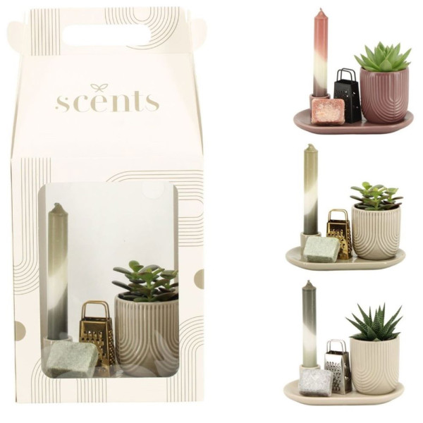 Erhöhen Sie das Erlebnis Ihres Geschenks mit einer einzigartigen Kombination aus Duft und Grün, die eine warme und einladende Atmosphäre schafft. Das Aromatic Giftset large bietet ein umfassendes und luxuriöses Erlebnis von botanischer Schönheit und angenehmen Düften. Dieses Set enthält ein stilvolles Tablett, eine Pflanze in einem Keramiktopf, einen Bernstein-Duftblock, einen passenden Schaber und eine Kerze. Das gesamte Set ist elegant in einer Kartonverpackung mit einer Mischung aus drei Farben und einem transparenten Display verpackt, bereit zum Verschenken.