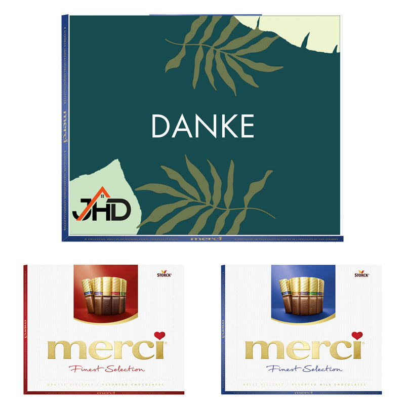 Original Merci Pralinen Box mit individuell bedruckte Karte auf der Vorderseite.