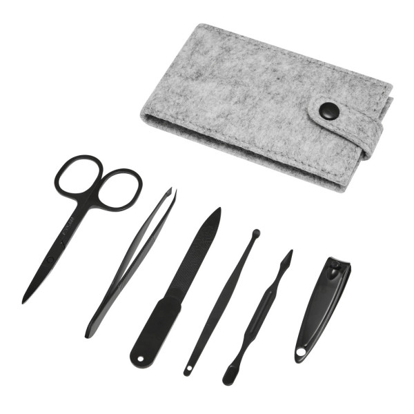 Maniküreset ELAINE PRO RPET, 6-teilig: bestehend aus Nagelschere, Nagelfeile, Pinzette, Nagelknipser, Ohrenstäbchen und Nagelschaber, im rPET-Filz-Druckknopfetui, in Box