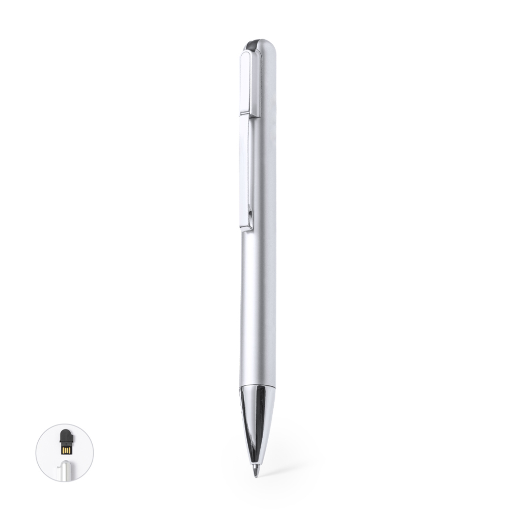 USB-Kugelschreiber aus robustem ABS mit glänzender Metallic-Oberfläche. Mit oben integriertem 16GB USB-Stick und Metallclip. Drehmechanismus, Jumbo-Patrone und blaue Tinte. Präsentiert in einer individuellen Blackbox.