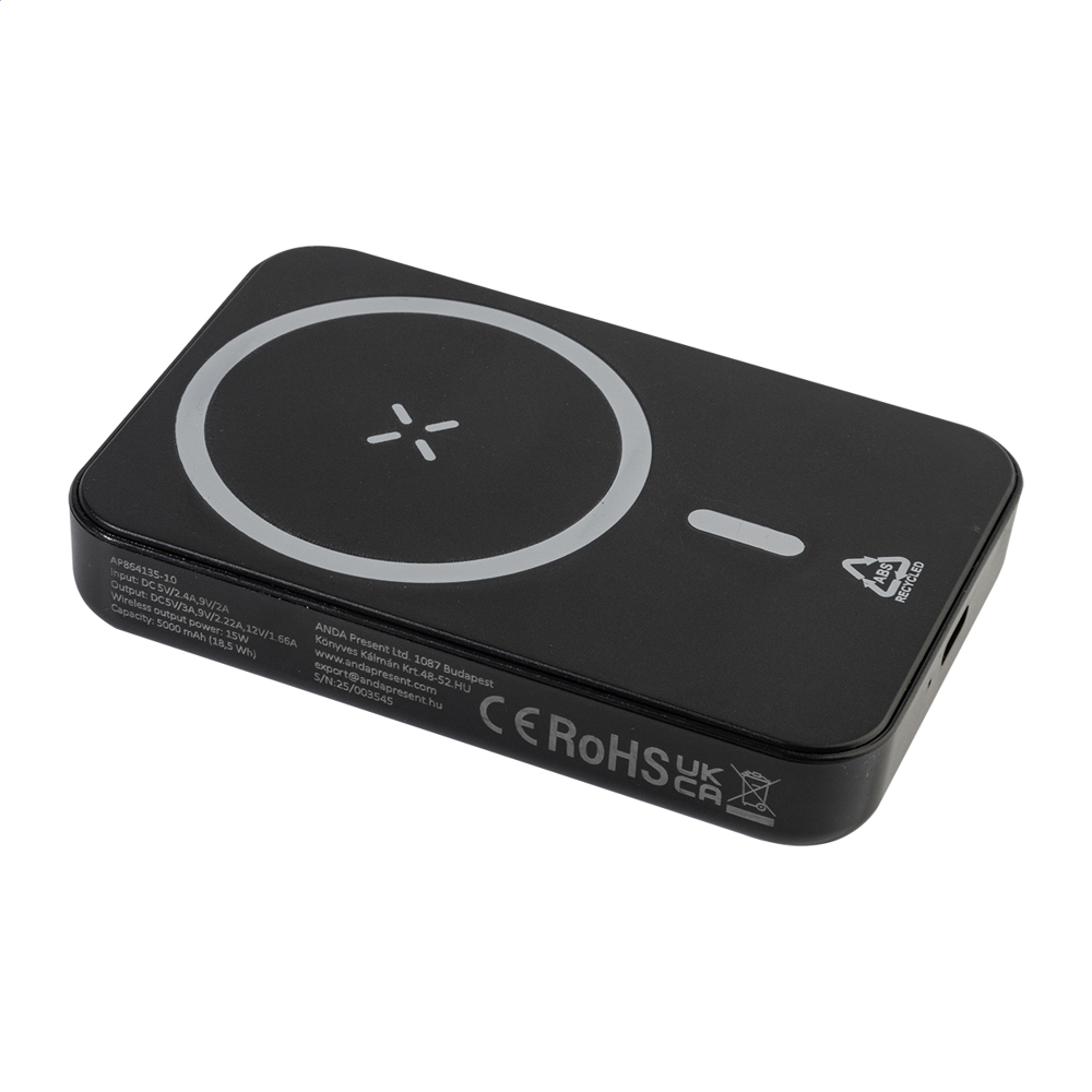 Powerbank aus recyceltem ABS mit 5000 mAh Akku, eigebautem Wireless-Fast-Charger (15W), USB-C Eingangs- und Ladeport. Inkl. selbstklebendem Metallring um die magnetische Funktion bei jeglichem Gerät mit Wireless-Charge-Option zu nutzen. Kompatibel mit iPhone® 12 oder neuer. Inkl. USB-Ladekabel.