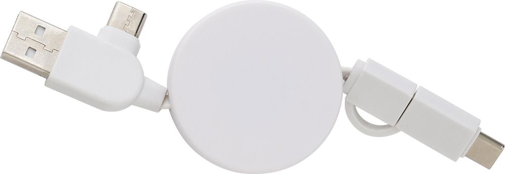 Verlängerbares ABS-Ladekabel mit Details aus Bambus. Mit USB-C, Lightning und USB-A. Einzeln verpackt in einem braunen Kartonbeutel.