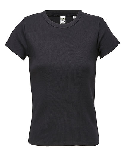 2x2 Rippe | Gekämmte, ringgesponnene Baumwolle | Feminines, tailliertes T-Shirt | Gerippte Bindung | Nackenband | Geschnitten und genäht | Aufkleber abreißen