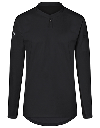 Vorderseite: Köpergewebe | Rückseite: Jersey-Piqué, atmungsaktiv, feuchtigkeitsregulierend | Lange Ärmel | Tailliert geschnitten | Halsausschnitt mit schmalem Stehkragen und kleiner Knopfleiste | Leistentasche am linkem Ärmel