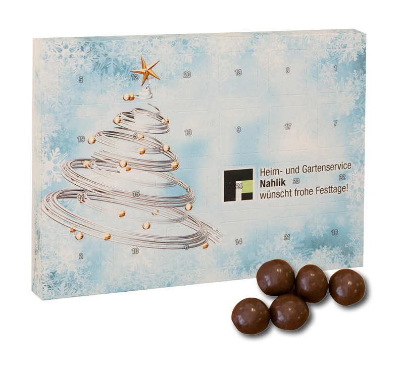 Tisch-Adventskalender im Kundendesign mit ausklappbarem stabilen Standfuß. 4-farbiger Druck und verschiedene Füllvarianten.