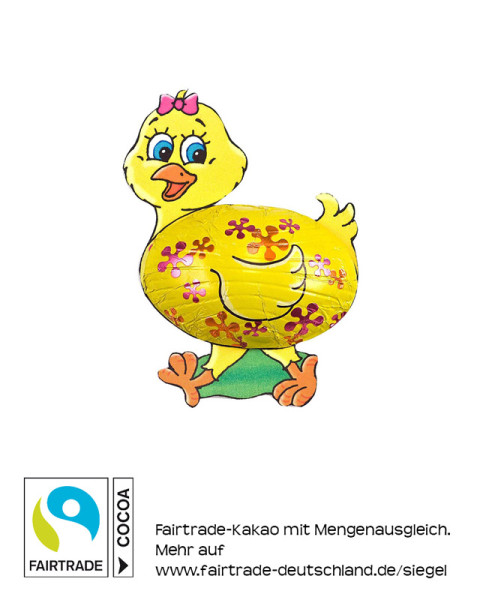 Schokoladen-Küken in bedruckter Folie. Fairtrade Edelvollmilchschokolade, mindestens 33% Kakao.
