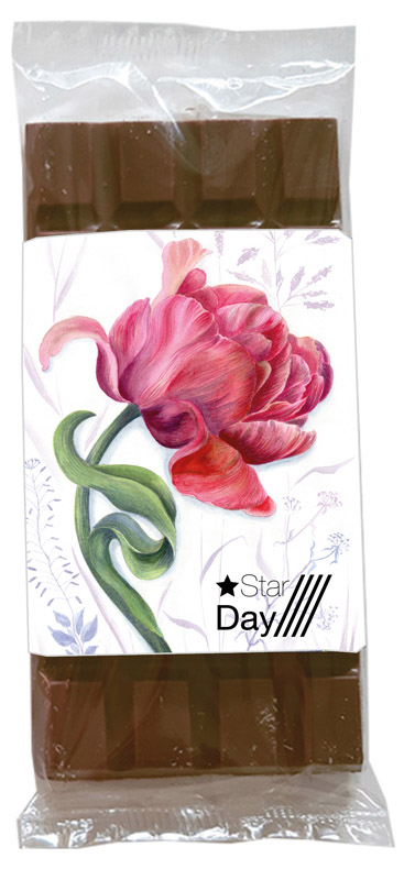 100 g Schokoladentafel in Confiserie-Qualität einzeln in Klarsichtfolie verpackt mit einer 4-fbg. bedruckter Banderole.