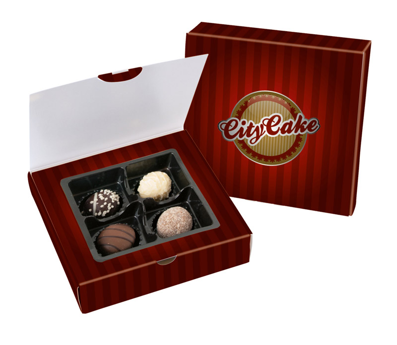 Eine Pralinenschachtel in Ihrer individuellen Gestaltung gefüllt mit Trüffelpralinen (ohne Alkohol). Jede Box wird geschrumpft, damit die Trüffeln Ihrem Geschmack und Aroma nicht verlieren.
