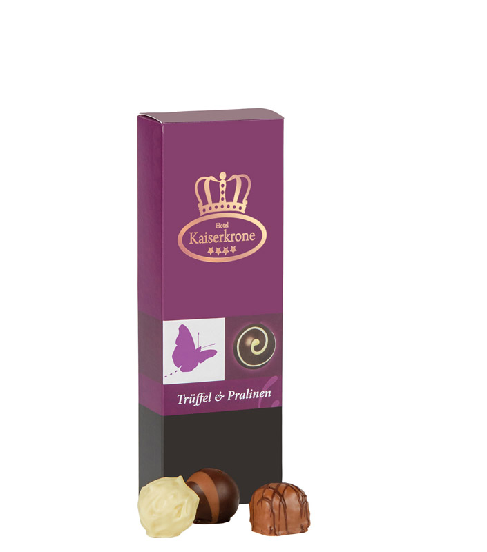 Individuell bedruckte Faltschachtel befüllt mit einer edlen, deutschen Pralinenmischung. Fünf verschiedene Pralinenmischungen zur Auswahl.
