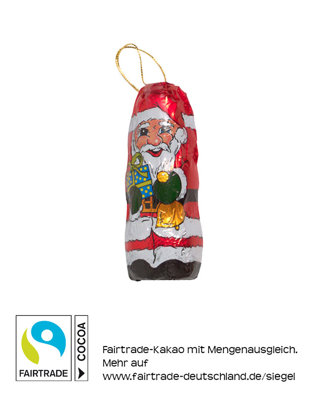 Schokoladen-Santa Claus in bedruckter Folie. Fairtrade Edelvollmilchschokolade, mindestens 33% Kakao.