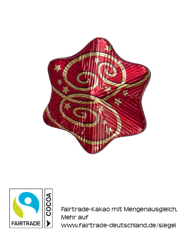 Schokoladen-Modern Art-Stern in bedruckter Folie. Fairtrade Edelvollmilchschokolade, mindestens 33% Kakao.