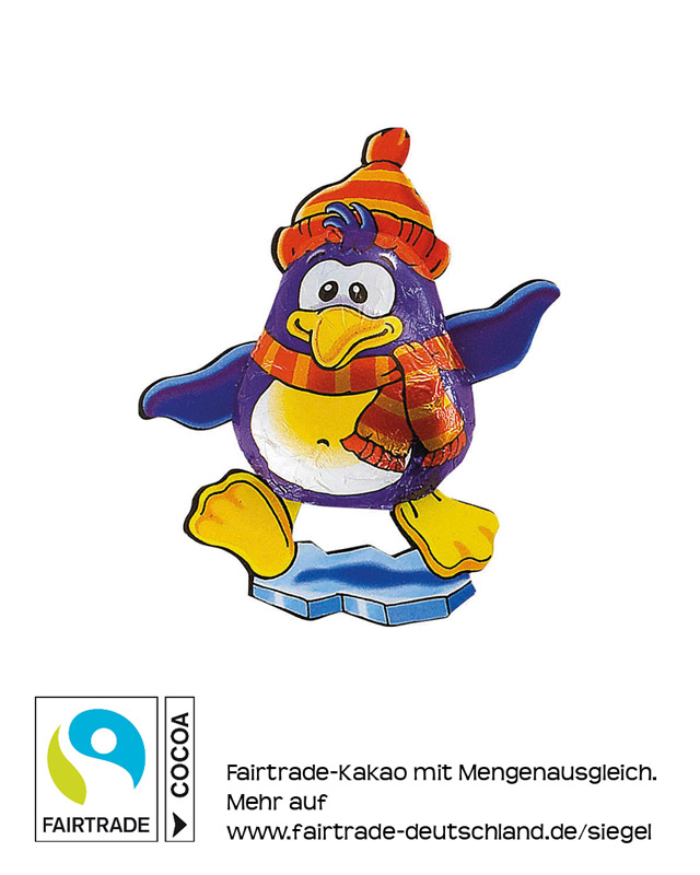 Schokoladen-Pinguin on the rocks in bedruckter Folie. Fairtrade Edelvollmilchschokolade, mindestens 33% Kakao.