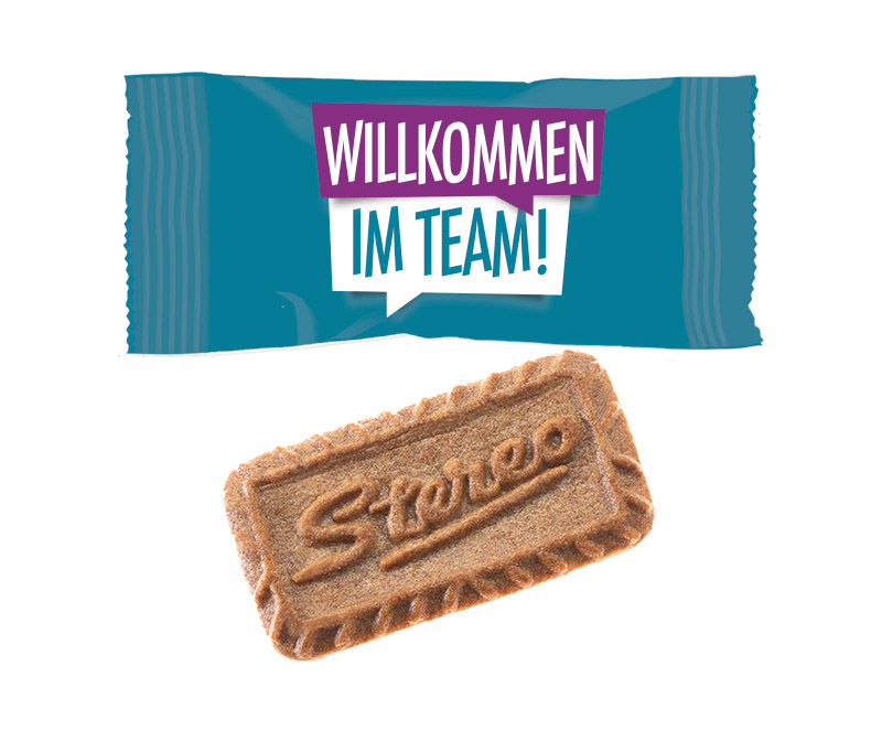 Karamellkeks einzeln verpackt im weißen oder transparenten Werbetütchen. Die Folie wird 4-farbig mit Ihrem Motiv gedruckt werden.
