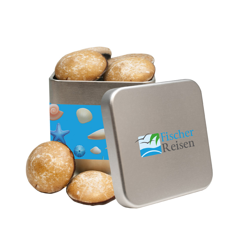 Silbermatte, quadratische Dose mit drei Veredelungsoptionen: Sie haben die Wahl zwischen Direkt-Digitaldruck auf dem Deckel, einem vierfarbigen 4-C-Etikett am Korpus oder einer Kombination aus beiden Veredelungen für maximale Markenwirkung. Die Min-Contrellas, mit Ihrer glasierten Oberfläche und dem schokolierten Boden, sind die perfekt Füllung für diese handliche Dose versehen mit Ihrer Werbung.