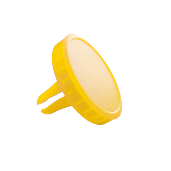 Lufterfrischer mit Zitronenaroma für die Befestigung an der Auto-Lüftung. Mit Gehäuse in fröhlichen Farben und spezieller Stanzung für die Personalisierung mittels Doming / 3D Gel-Aufklebern.