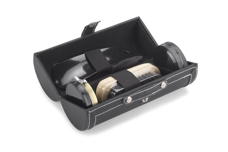 SHINBO Schuhputzset aus lederähnlichem Material (PU). Enthält klare Politur, Reiniger, Schuhlöffel, Tuch und Bürste.