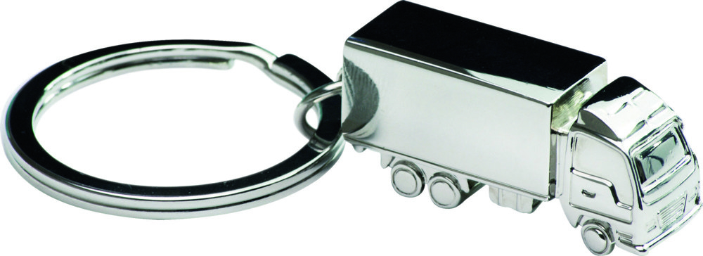Schlüsselanhänger - Mini-Laster. Sehr genaue Wiederspiegelung eines richtigen Lasters. Chrom-Metall. Gepackt in eine elegante schwarze Box. Das Logo wird auf der Plane des Sattelaufliegers aufgetragen.