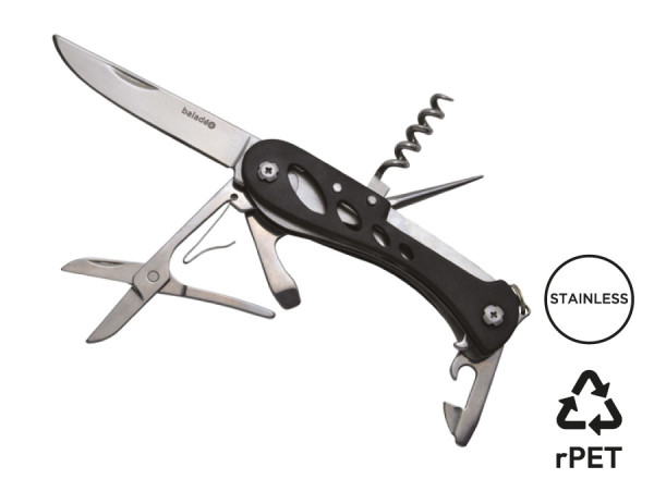 Profi- und Freizeitmesser mit Metall- und Holzelementen. Rostfreier Stahl, 73mm Klingenlänge, VPE 120. Gürtelclip und -etui, Designkarton