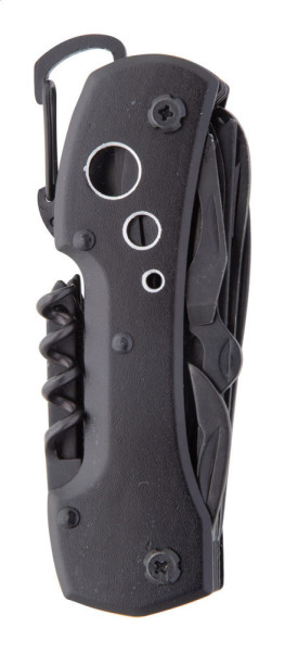 Komplett schwarzes Edelstahl-Taschenmesser mit 13 Funktionen, Aluminium-Griffen und Karabiner.