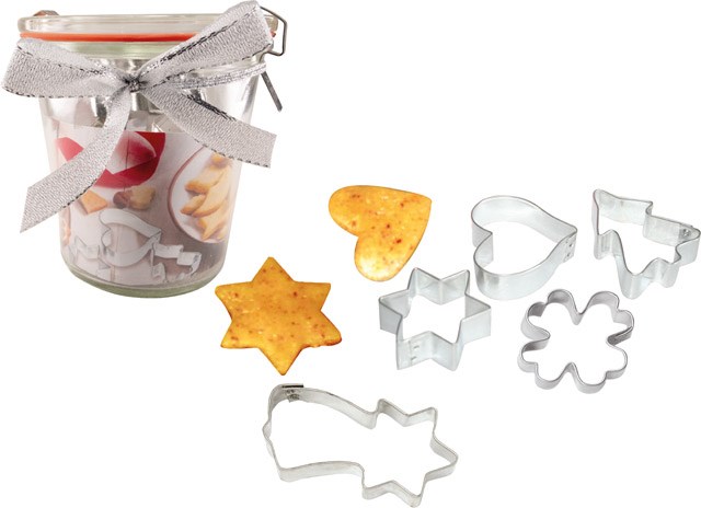 Elegant und absolut praktisch: das Weckglas zum Verschließen mit 5 verschiedenen Ausstechformen (Baum, Herz, Stern, Komet, Kleeblatt) für die Weihnachtsbäckerei. So können die Ausstechformen geschützt aufbewahrt werden. Platz für den Werbedruck ist auf dem Standardmotiv des Einlegers oder eine eigene estaltung, jeweils ab 100 Stück. Inhalt: Weckglas (290 ml), 5 Ausstechformen, je ca. 5 cm (Tannenbaum, Herz, Stern, Komet, Kleeblatt), Rezept auf Einleger (ohne Gebäck)