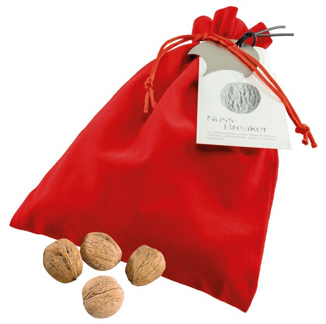 Sehr edel ist dieses Nuss-Säckchen mit rotem Samtsäckchen, ca. 100 g Walnüssen und Edelstahl-Nussbreaker. Der Werbeandruck ab 100 Stück erfolgt auf dem Standardmotiv des Anhängekärtchens. Eine eigene Gestaltung des Kärtchens kann ab 100 Stück realisiert werden. Zudem besteht die Möglichkeit für einen Tampondruck oder eine Lasergravur auf dem Edelstahl-Nussknacker, der nachhaltig in Erinnerung bleibt.