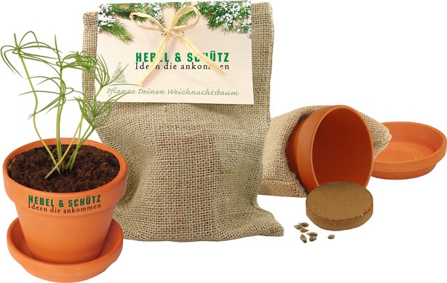Ein Stück Natur beinhaltet dieser Jutesack. Neben der Pflanzanleitung ist alles dabei für die Anzucht einer kleinen Fichte-Pflanze: Tontopf 9 cm mit Untersetzer, Samen und Erdtablette. Platz für den Werbedruck ist auf dem Standardmotiv des Headers oder eine eigene Gestaltung, jeweils bereits ab 250 Stück.