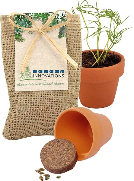 Ein Stück Natur beinhaltet dieses kleine Jutesäckchen. Neben der Pflanzanleitung ist alles dabei für die Anzucht einer kleinen Fichte-Pflanze: Tontopf 4 cm, Samen und Erdtablette. Platz für den Werbedruck ist auf dem Standardmotiv des Headers oder eine eigene Gestaltung, jeweils bereits ab 250 Stück.