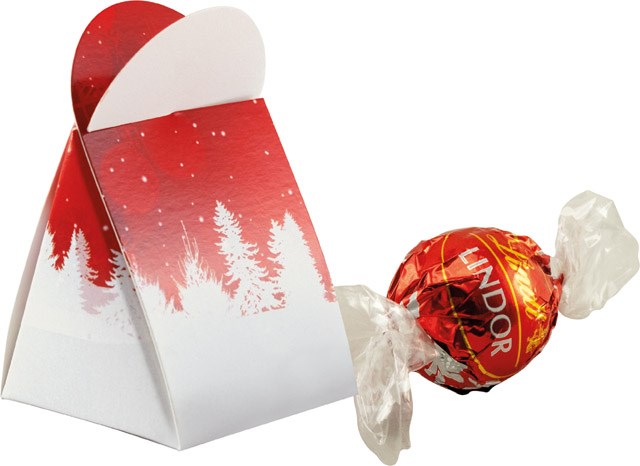 Ein kleines Geschenkpäckchen für Ihre Kunden. Überreichen Sie diese Überraschung und Ihre Kunden werden die köstliche Schoko-Kugel von Lindt genießen. Ihr Werbeeindruck oder eine individuelle Gestaltung des Päckchens ist ab 250 Stück möglich.