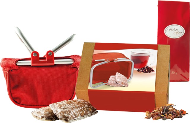 Dieses rote Körbchen beinhaltet ca. 50 g Weihnachts-Früchtetee und 2 Elisenschnitten zum Genießen. Klein und praktisch, dient er als Aufbewahrungskorb vieler gesammelter Utensilien. Alles für den Schreibtisch, Notizen oder Badeutensilien und Werkzeug, Taschenlampe, Flaschenöffner, Streichhölzer. Zusammengefaltet im Präsentkarton überreicht, macht dieser pfiffige Korb Freude. Werbeeindruck auf dem Standardmotiv der umlaufenden Banderole oder eine eigene Gestaltung, jeweils ab 100 Stück. Ein Tampondruck direkt auf dem Korb ist ab 100 Stück möglich.