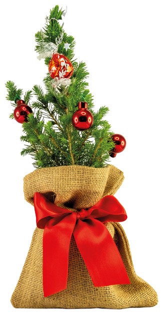 Eine lebende Zuckerhutfichte 20 - 30 cm, verpackt in einer Einzelversandkartonage, als kleines Bäumchen zu Weihnachten. Klassisch und dekorativ versetzt diese Zuckerhutfichte jeden Raum in eine weihnachtliche Stimmung. Das Bäumchen kann auf Wunsch von uns direkt an einzelne Empfänger versendet werden. Geschmückt ist das Bäumchen mit 5 roten Weihnachtskügelchen und einer Lindt Schoko-Kugel (12,5 g). Deko für den Topf: Jute, Schleife rot. Die Farben der Kugeln (rot, orange, blau, silber), Schleifen (rot, orange, blau, gold, silber) und Topffolien (gold, silber, Jute, Naturpapier) sind beliebig kombinierbar. Ein Werbeeindruck kann auf unserem Anhängekärtchen Artikel 6202 (40 x 60 mm) ab 100 Stück erfolgen oder auf einer Beilage nach Wunsch. Zudem steht als Werbefläche ein separater Schuber, Art.-Nr. 4199-8, zur Verfügung.
