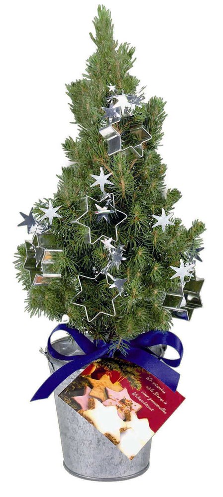 Inhalt: Bäumchen 20-30 cm geschmückt mit 5 Ausstechformen Stern, je ca. 5 cm, Zinkeimer, Rezeptkarte, Schleife blau