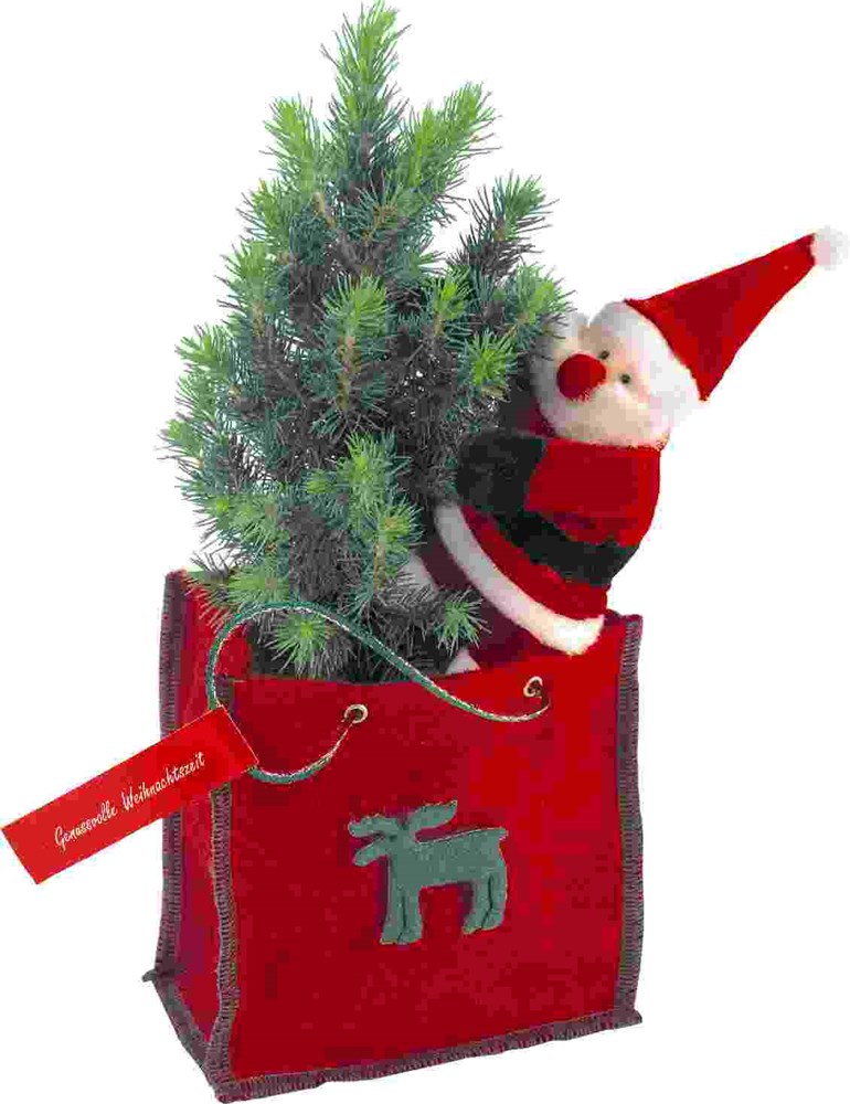 Eine lebende Zuckerhutfichte 20 - 30 cm mit magnetischen Weihnachtsmann verstaut in einer schönen roten Filztasche. Ein Werbegeschenk zu Weihnachten, über das sich jeder freut und das nachhaltig in Erinnerung bleibt. Bestens geeignet für die weihnachtliche Deko. Der Werbedruck ab 100 Stück ist möglich auf dem Standardmotiv des Anhängekärtchens. Eine eigene Gestaltung des Kärtchens ist bereits ab 100 Stück realisierbar. Inhalt: Bäumchen 20-30 cm, magnetischer Weihnachtsmann, Filztasche