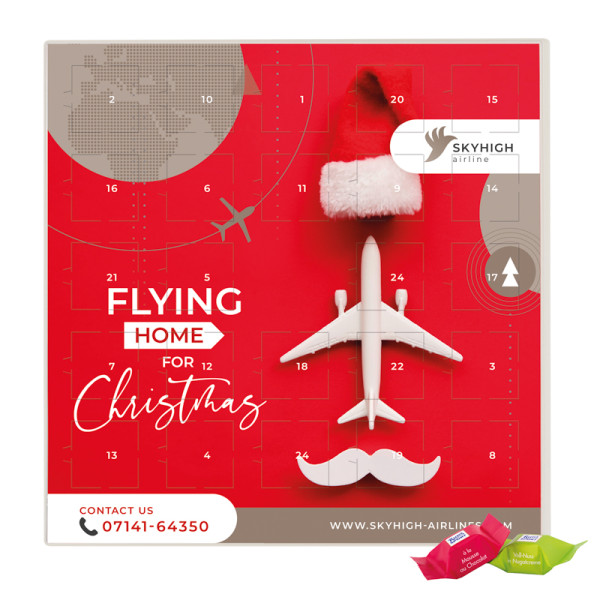 Quadratischer Adventskalender mit aufgeklebtem Deckblatt und kompostierbarem Tiefziehteil in Créme-Weiß, individuell bedruckt. Inhalt: 24 Ritter SPORT Schokowürfel, variierende Mischung aus den Sorten : Schoko Crisp, Mousse au Chocolat, Vollnuss in Nugatcreme, Karamell Duo, 192 g