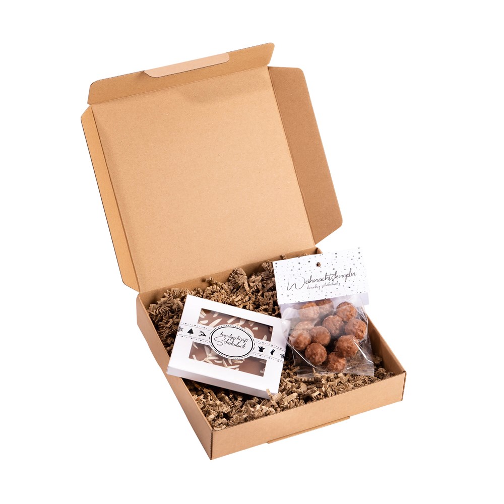 Mit diesem ebenso sympatischen wie leckeren Mailing werden Ihre Kunden oder auch Mitarbeiter Augen machen. Der Inhalt spricht für sich - eine Tafel handgeschöpfte Edel-Vollmilchschokolade, die mit gerösteten Mandeln bestreut wurde und ein ganzer Beutel mit schokolierten kleinen Weihnachtskugeln. Die Knusperkugeln werden mit Reis-Mais-Pops, Haferflocken und erlesenen Weihnachtsgewürzen hergestellt. Die Banderole und die Faltkarte sind bereits fertig gestaltet - gerne legen wir eine entsprechende Grußkarte bei oder Sie übernehmen den einzelversand selbst.