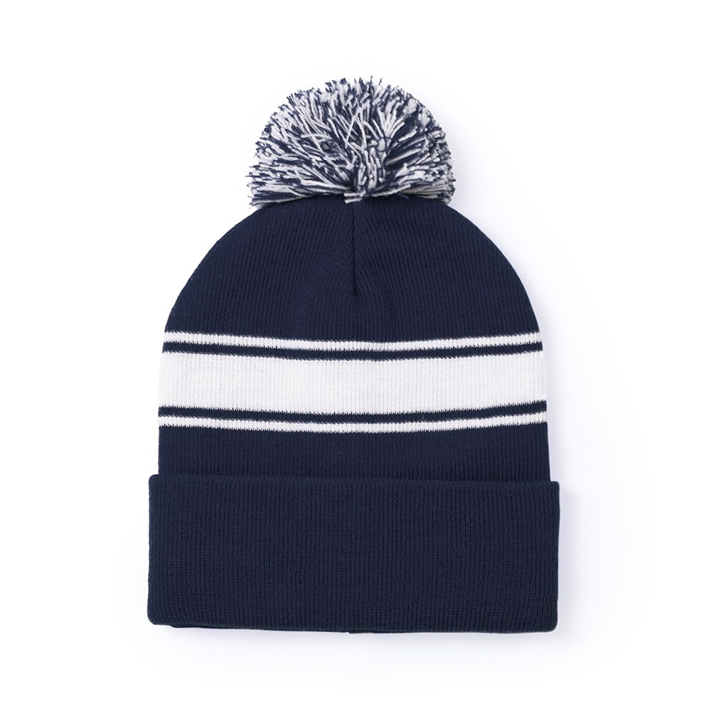 Weiche und warme Mütze aus Acryl in einer Vielzahl von Farben. Mit originellem Design, weißem Streifen und farblich passendem, zweifarbigem Bommel.