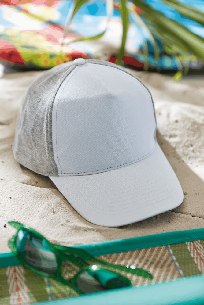 5-Panel-Baseball-Cap UP TO DATE, 2-farbig: verstärktes Frontsegment in Canvas-Optik, übrige Segmente aus Jersey, 4 gestickte Luftlöcher, Knopf, farbig abgesetzter und größenverstellbarer Klettverschluss am Hinterkopf