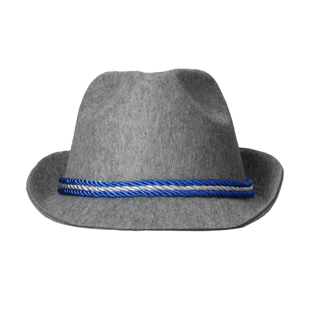 Modischer, grauer Filzhut mit kleiner, asymmetrischer Krempe und weiß- blauem Band bestehend aus drei einzelnen Kordeln. Der Hut ist leicht und hat eine feste Form.