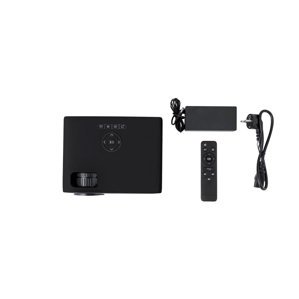 Projektor mit Bluetooth und WiFi-Konnektivität, die ein fantastisches audiovisuelles Erlebnis bietet. Hergestellt aus robustem schwarzem ABS, mit Fokus- und Winkelverstellung für optimale Sicht. Es hat eine Ausgangsleistung von 7.000 Lumen, mit 1080p-Auflösung und verfügt über einen leistungsstarken 5W-Lautsprecher. Darüber hinaus verfügt es über zahlreiche Anschlüsse: 3xHDMI (1 Stecker + 2 Buchsen), USB-Anschluss, 3,5-mm-Audioausgang und 3,5-mm-Audioeingang. Mit Micro-SD-Speicherkartensteckplatz und Fernbedienung für eine bequeme und einfache Handhabung des Geräts. Es enthält ein 220V-240V AC-Netzkabel und wird in einer Kraft-Design-Box präsentiert.