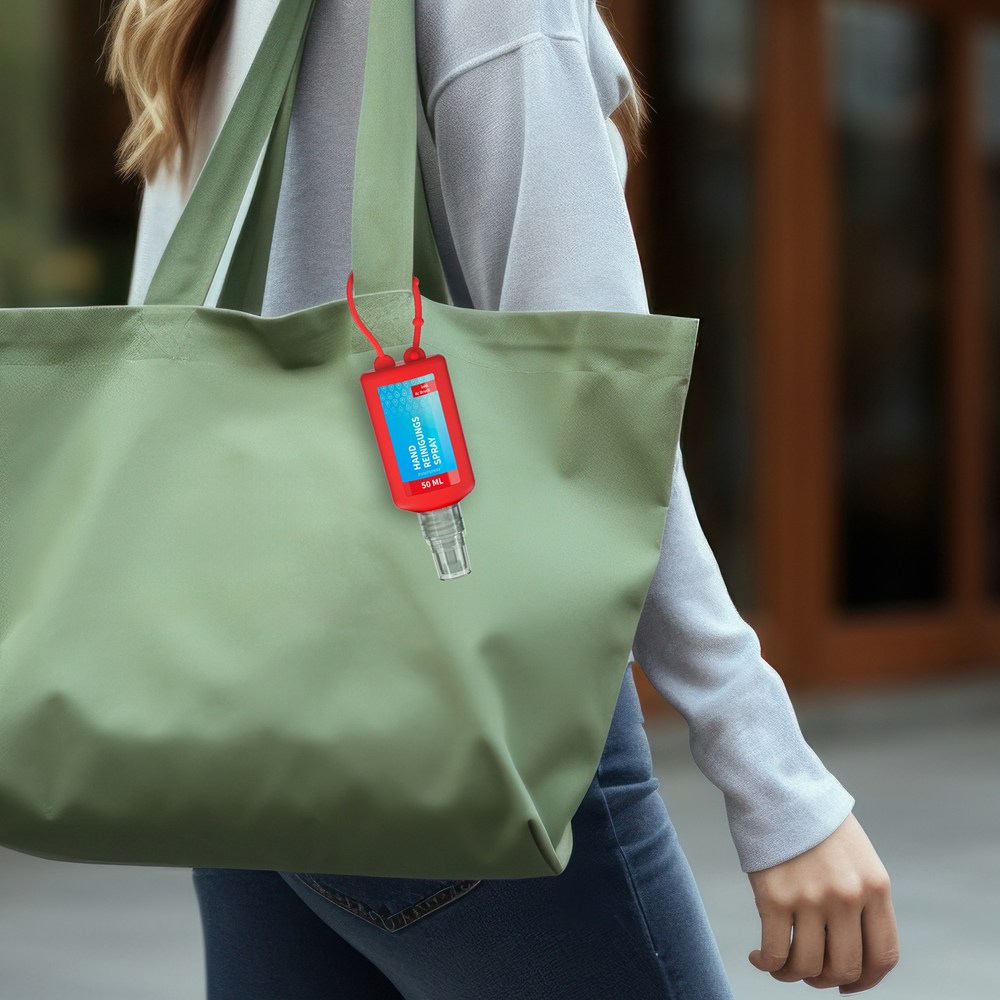 Handreinigungsspray, 50 ml Bumper rot, Body Label (R-PET)
