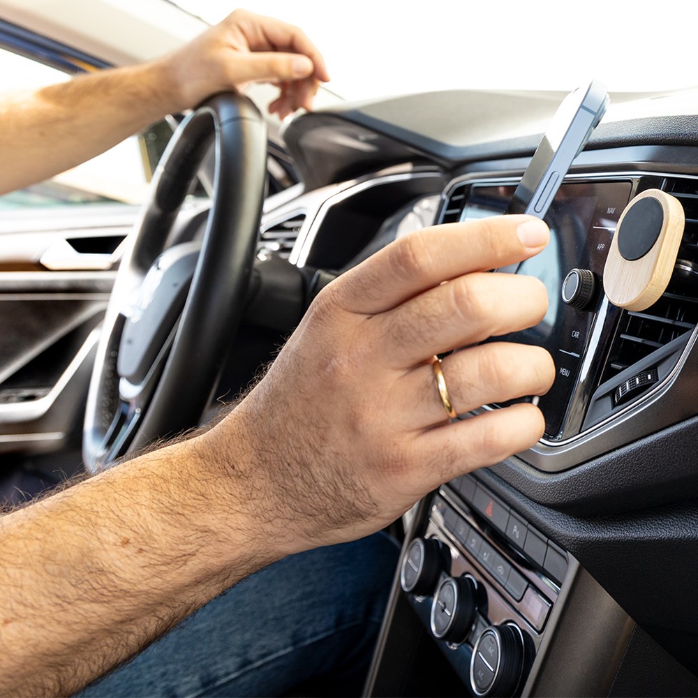 Lüftungshalterung für Smartphones aus Bambus. Bequeme und sichere magnetische Befestigung. Inklusive Klebering. Präsentiert in einer individuellen Ökodesign-Box aus Kraftkarton.Materialien wie Bambus fördern die Verwendung von natürlichen Rohstoffen und reduzieren die Schadstoffemissionen. Es handelt sich um eine sehr widerstandsfähige Pflanze, die sich durch ein vielseitiges Wachstum und eine schnelle Regeneration auszeichnet und eine hervorragende Alternative zur Verwendung von herkömmlichem Holz darstellt.
